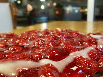 Cherry Pie Pizza with crushed graham crackers and vanilla icing.