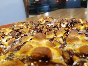 Creamy peanut butter with chocolate chips and marshmallows topped with crushed graham crackers and chocolate syrup.